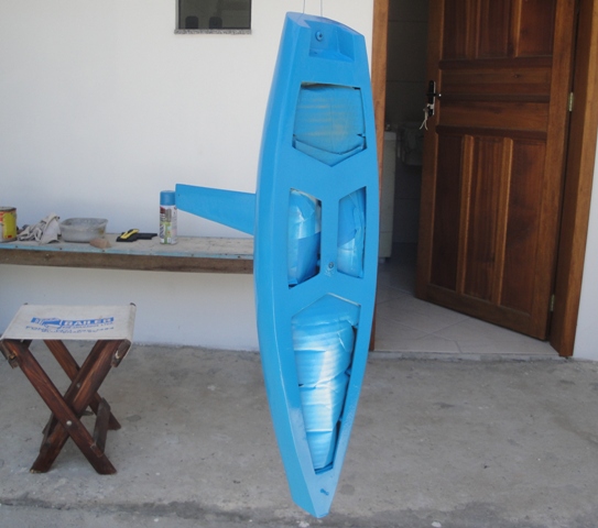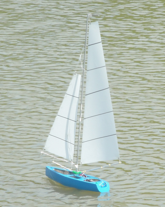 Após a montagem, fomos pra água fazer o teste tão esperado. Estava ansioso para saber se iria ter alguma infiltração de água por algum canto e se ele ficaria bem equilibrado com relação a linha da água. Para minha surpresa o resultado foi muito bom, não entrou água em nenhum momento, ficou bem equilibrado e até navegou bem mesmo com pouco vento. Para realizar o teste, como não havia ainda a montagem da parte eletrônica, utilizou-se uma linha de pesca para fazer um guia e obter-se um pequeno controle sobre o mesmo.