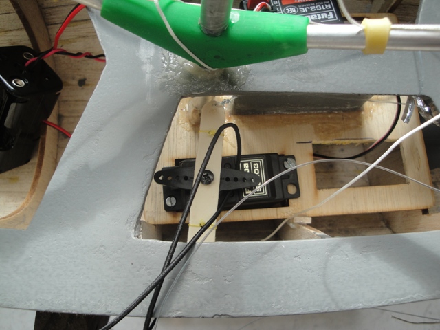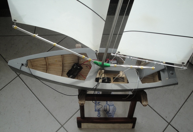 Nessa etapa ainda não tinha o servo correto para vela, então procurei improvisar com o servo S3003 que veio junto com o controle e que é usado no leme. Infelizmente não ficou bom e não consegui economizar, fui obrigado a comprar o Servo GWS S125 1T 2BB Sail Winch conforme a especificação do projeto.
